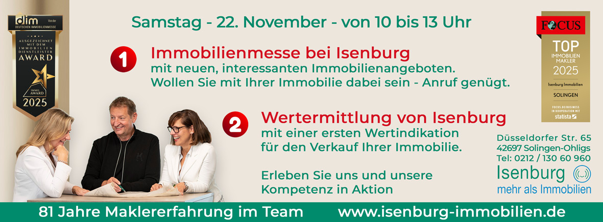 Bei Isenburg Immobilien in Solingen stehen die Menschen und ihre individuellen Lebenslagen im Mittelpunkt unserer Arbeit. Als erfahrene Immobilienberater bieten wir Ihnen einen menschlichen, persönlichen und bewussten Ansatz, der auf authentischer und erfolgreicher Beratung basiert.